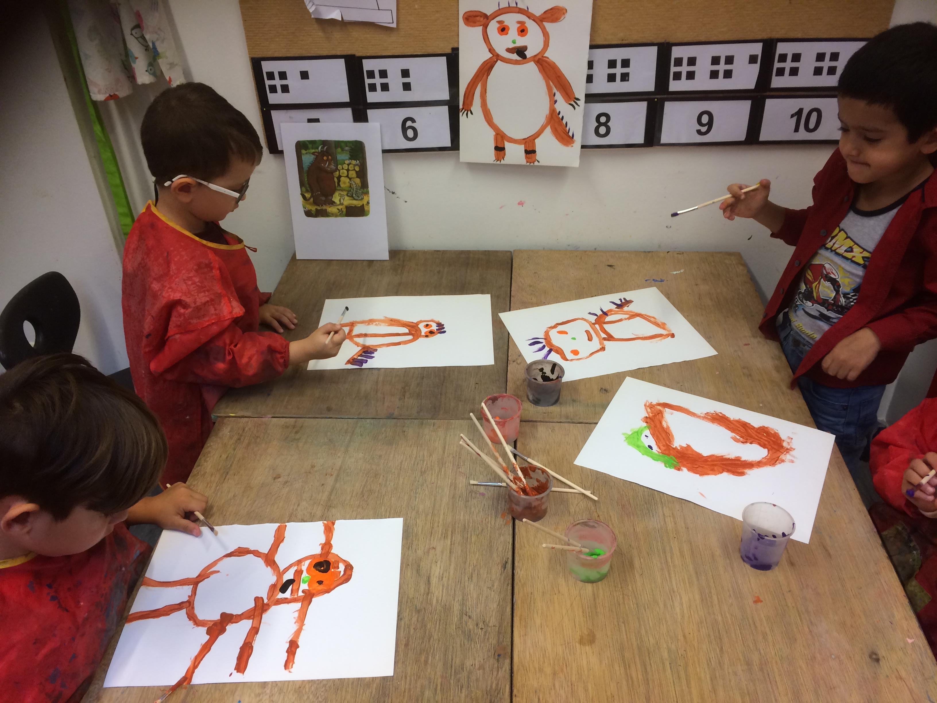 Gruffalo's schilderen, elkaar helpen bij moeilijke spelletjes, 1,2,3 piano op de speelplaats...