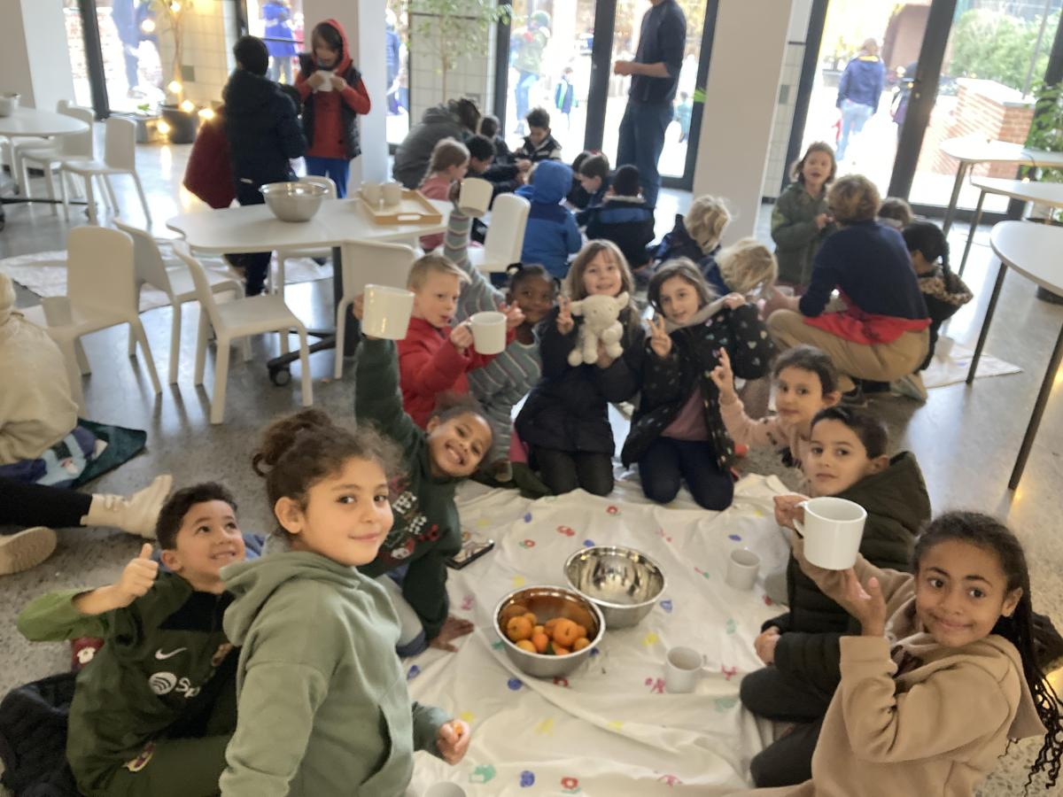 We picknickten binnen op dekentjes met de hele school. We dronken warme chocolademelk en aten manderijntjes.